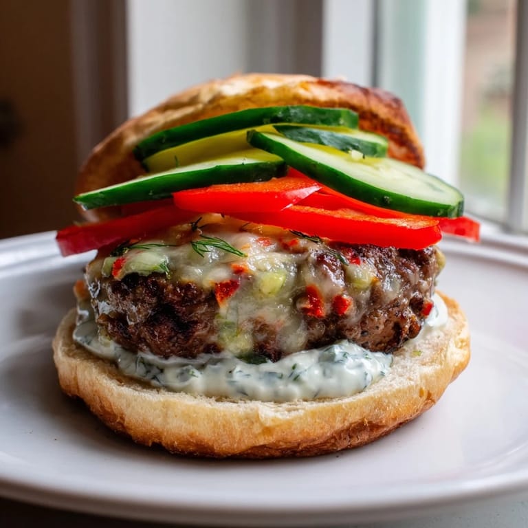 Pin it I discovered this burger combination completely by accident one summer when I had both a cooling Greek yogurt leftover and a handful of fiery red peppers that needed using before they wilted. The contrast between the scorching heat of pepper-jack cheese and the smooth, dill-kissed yogurt was revelatory—suddenly a burger felt like a proper flavor adventure instead of just lunch. That day taught me that the best dishes often come from constraints, not careful planning.