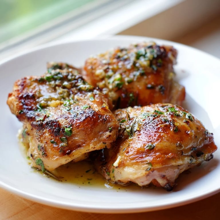 Pin it Juicy chicken thighs roasted to perfection in a rich garlic butter sauce with aromatic herbs—crispy on the outside, tender on the inside, and bursting with flavor. This recipe brings the comforting aromas of a gourmet kitchen into your home with minimal effort, making it a perfect centerpiece for any dinner table.